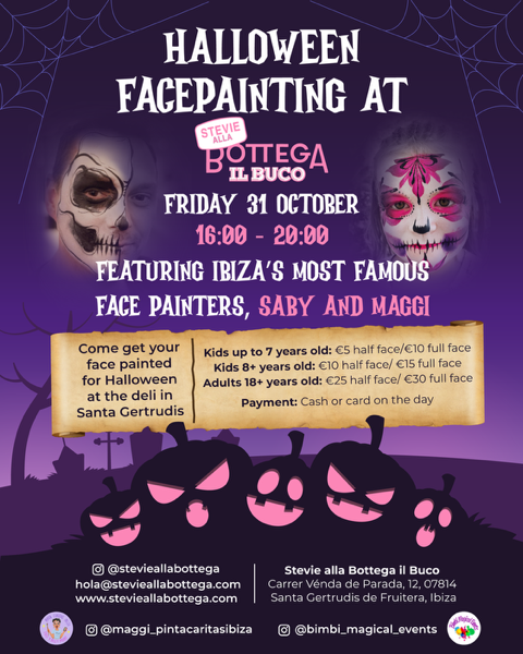 Únete a la diversión con esta fantástica actividad de Halloween para toda la familia. El viernes, 31 de octubre, de 16:00 a 20:00 h, Stevie alla Bottega Il Buco en Santa Gertrudis ofrecerá una sesión de pintacaras para niños y adultos.