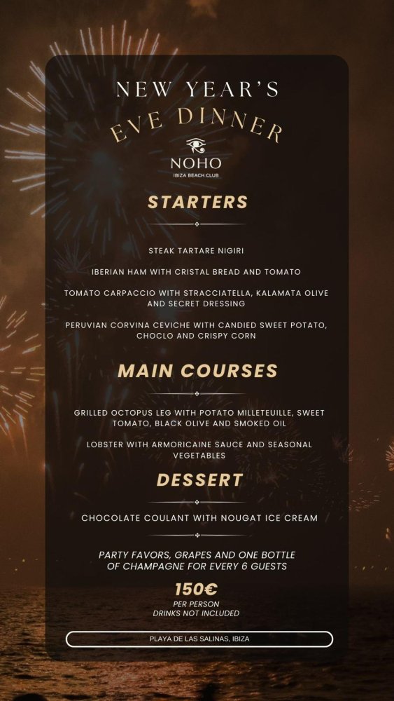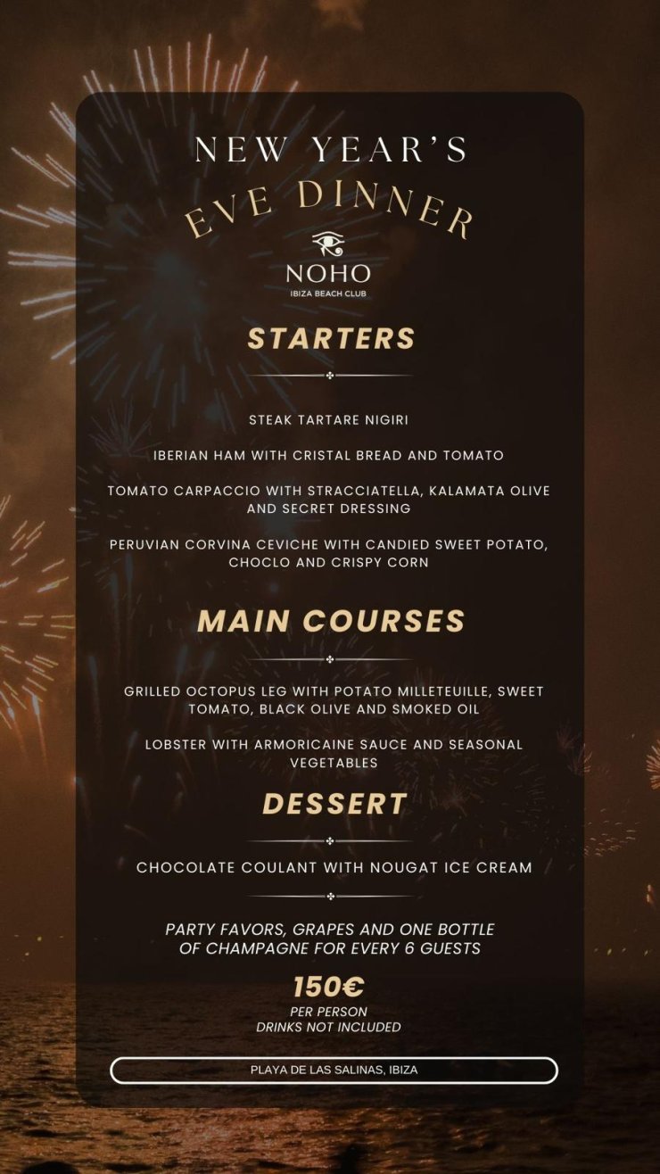 El 31 de diciembre de 2025, NoHo Ibiza Beach Club en la playa de Las Salinas acoge la última cena del año con una celebración especial de Nochevieja junto al mar.