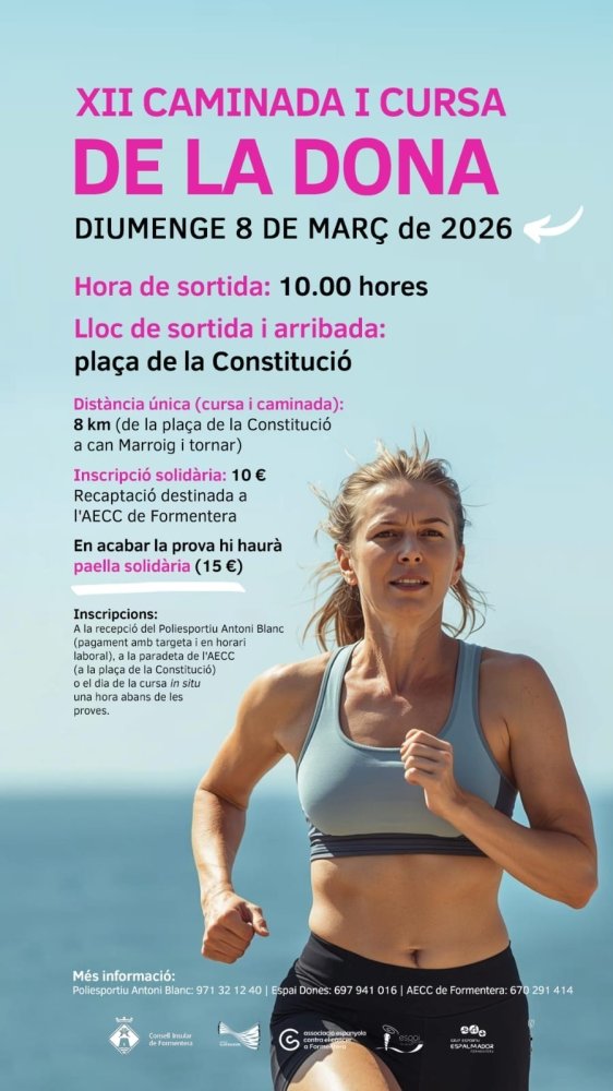 Para conmemorar el Día Internacional de la Mujer, el Consell de Formentera organiza cada año la Cursa Solidària per la Dona, una carrera solidaria que tendrá lugar el domingo, 8 de marzo de 2026.