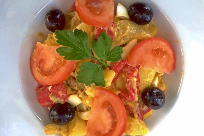To gain the best overview of Bar Restaurant Es Cubells's lunch time menu, between us, we ordered every choice on the menu del dia. As a starter, two of us chose Ensalada Ibicenca (traditional Ibiza salad); a deliciously creamy combination of potato, egg, onion, peppers and artichoke, topped with tomatoes, olives and a leaf of fresh parsley. Our friend's starter of garlic soup was certainly an interesting dish and not what she had expected at all! As well as generous slices of garlic, the soup contained onion and bacon with a fried egg and slice of fried bread placed delicately on the top.