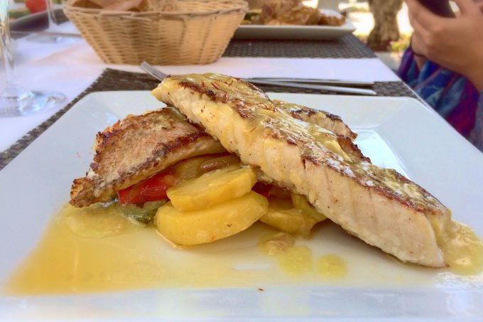 Oliver brought us a basket of bread and Ibiza's ever-popular appetiser, alioli (a creamy mixture of garlic and oil with a consistency similar to mayonnaise), along with a dish of olives to share as we made a start on the extremely good bottle of house red.