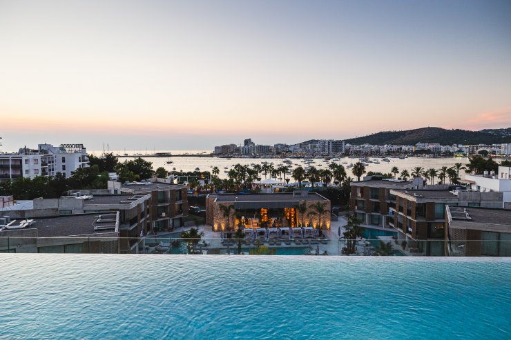 Ante ti, se vislumbran destellos del atardecer en el magnífico horizonte de San Antonio, mientras los tonos naranjas y morados se transforman en oscuridad y las luces centelleantes de la segunda ciudad más grande de Ibiza cobran vida. Si te fijas bien, podrás vislumbrar la vibrante vida que se desarrolla abajo, un marcado contraste con el ambiente relajado de la azotea.