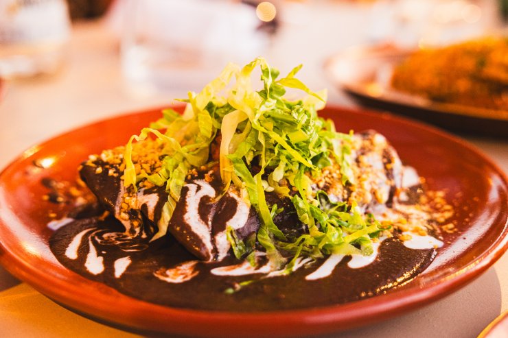La enchilada clásica estaba repleta de pollo y bañada en mole de frijoles refritos, terroso, cálido y ligeramente cremoso. El chile guajillo le daba a la salsa ese toque afrutado y ahumado.