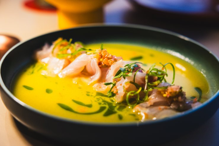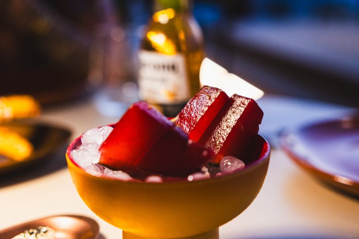 Un refrescante interludio. Trozos de sandía dulce, infusionados con mezcal por ósmosis, ofrecieron un sabor realmente interesante. El dulzor de la fruta se vio realzado por el licor clásico, con ligeros toques ahumados que persistían en el fondo.