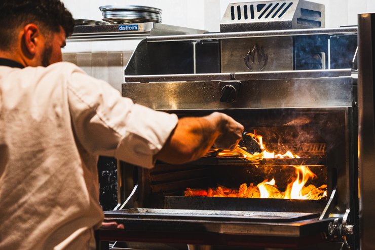 La cocina abierta y la llamativa parrilla de llama, sin duda, nos llamaron la atención y dieron vida a la carta en un instante.
