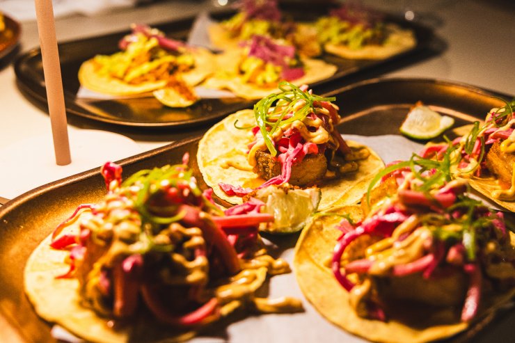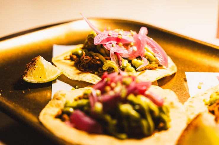 Cochinita Pibil: Cerdo tradicional cocinado a fuego lento, marinado en jugo de cítricos y pasta de achiote. De gran sabor, la carne desmenuzada se aderezaba con un vibrante aderezo de aguacate y cebollas rojas encurtidas.