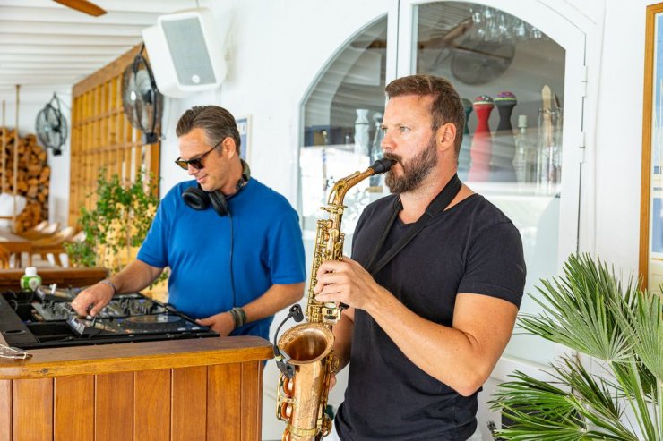 Con DJ Elliot a la mesa, la música (Balearic Chill, ideal para un almuerzo relajado de estilo mediterráneo) se adapta perfectamente al ambiente relajado. A medida que pasa el tiempo y nuestros compañeros comensales se divierten, el ritmo se acelera y lo acompaña un saxofonista.