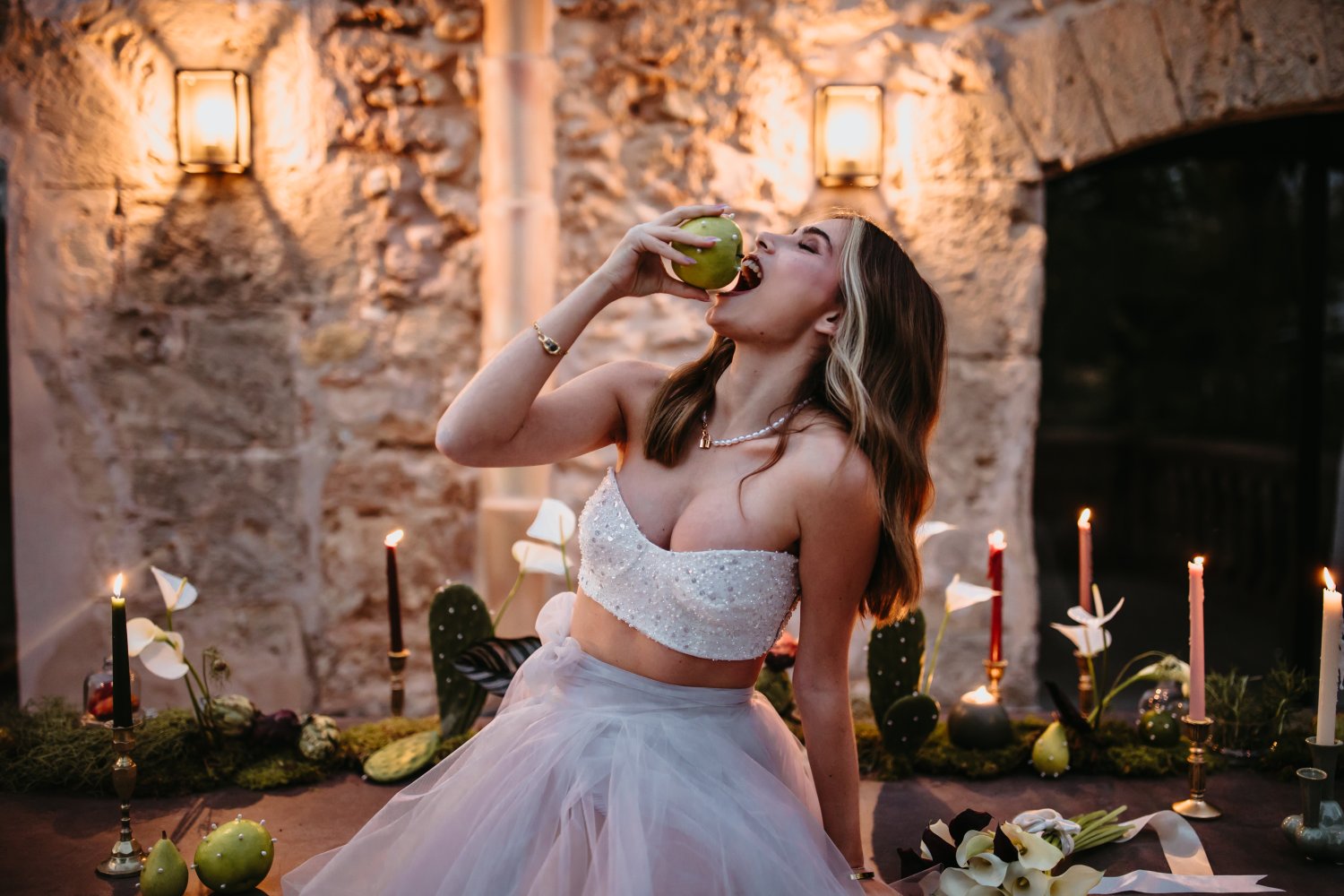 Ahora estamos empezando a ver un cambio de nuevo. Los flecos, las texturas en capas y la actitud de "más es más" están reemplazando el minimalismo sobrio de la reciente era de las "chicas limpias". Naturalmente, esto se filtrará en las bodas. A partir de esto, se puede esperar un estilo más envolvente, con abundantes flores, combinaciones de colores atrevidas, texturas impactantes e instalaciones de iluminación impactantes. El look es menos refinado y más expresivo, caprichoso y con capas.