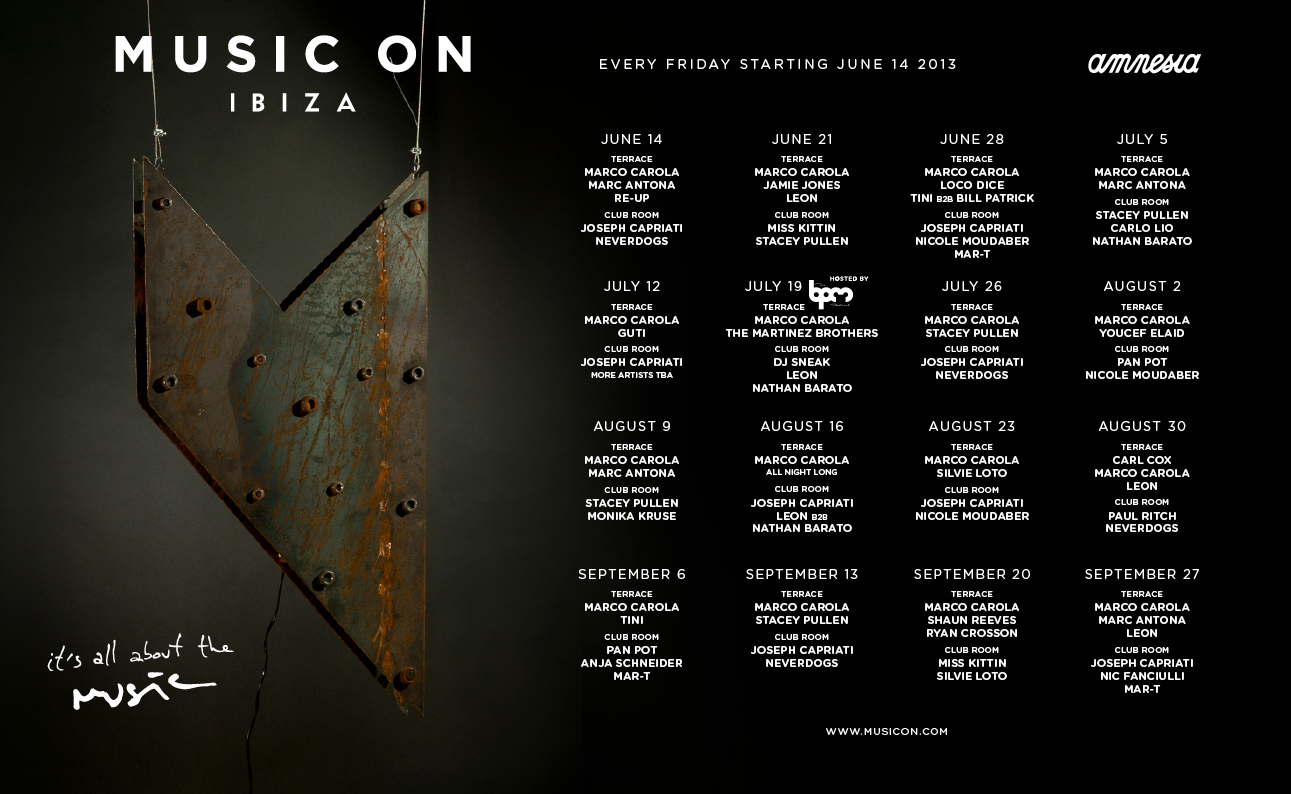 In 2012, Marco Carola split off from his Cocoon family, for whom he'd been playing with for many years, and started his own party. Friday nights at Amnesia took on an entirely new atmosphere and music policy from the previous year (2011), where MTV Ibiza (now working with Ibiza Rocks) laid on such artists as Snoop Dogg and Primal Scream, with a strong focus on tough techno from the Italian and his band of artist mates.
